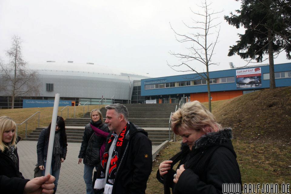 Trotz der frühen Abfahrt zum Sonntagmorgen setzte sich dieses Mal der Bus in Richtung thüringische Landeshauptstadt pünktlich in Bewegung (beim letzten Spiel war der Bus leider ausgefallen und es musste mit dem Pkws gefahren werden => hier). Es herrschte unter Fans und Spielern eine fröhliche Stimmung, obwohl allen bewusst war, dass es kein einfaches Spiel werden wird. Denn das letzte Spiel in Erfurt wurde mit 4:2 verloren.