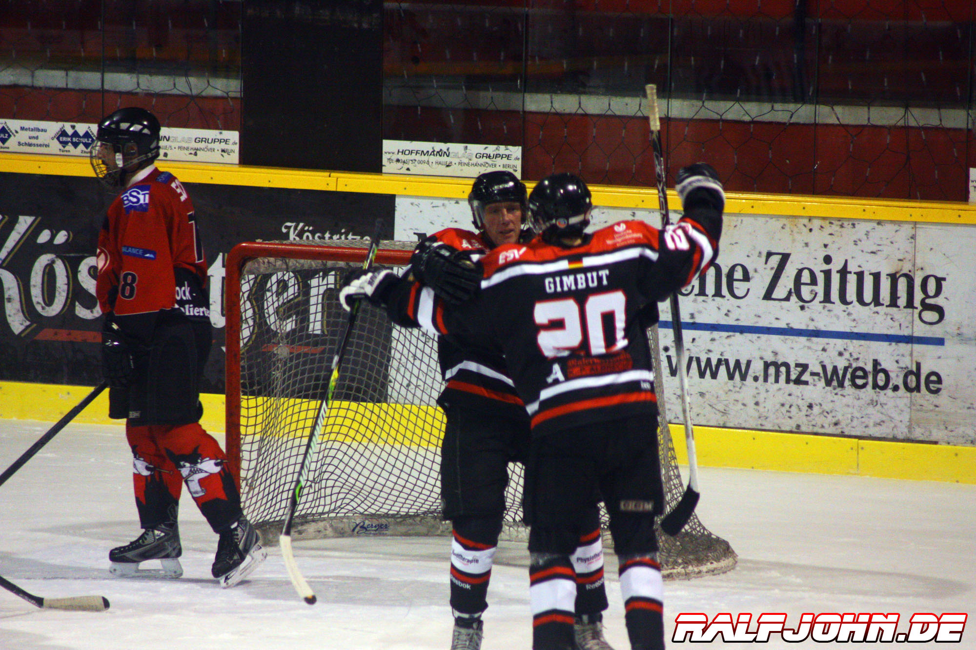 Da Stürmer Mike Schmölling bei seinem Break zur Mitte des ersten Abschnittes allein im gegnerischen Drittel stand spielte er den Puck über einen gegnerischen Verteidiger und dieser fälschte ihn so günstig ab, dass er wieder bei Schmölling landete und guter Schussposition vor dem Tor stand. Und er hielt zum Freude der rund 30 Fans in der Halle einfach nur drauf und erzielte den Führungstreffer. Doch zum Tore kassieren waren die Thüringer nicht nach Halle gekommen und legten ihrerseits gleich mit dem Treffer von Carsten Heinrich zum 1:1 nach. Im Gegensatz zum letzten Spiel ließen sich die Bulls jedoch von diesem Treffer nicht aus dem Konzept bringen und verfolgten weiter ihr Spiel in Richtung Tor vom Erfurter Danny Hildebrandt. Dieser musste nach den Treffern von Steffen Koch und Andre Gimbut noch zwei Mal im ersten Abschnitt hinter sich greifen bevor es in die Pause ging. Mit den Treffern konnten die Bulls die zwischenzeitliche Führung der Erfurter (Rabin) nicht nur ausgleichen, sondern selber wieder mit 3:2 führen.