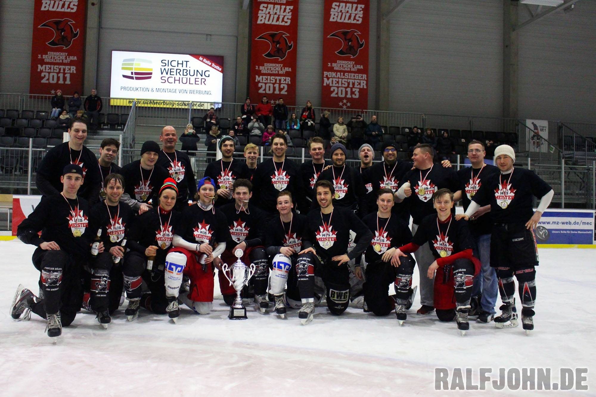 Im finalen Spiel der Landesliga Thüringen besiegten die Helden der zweiten Reihe die Kojoten von Medizin Erfurt mit 10:5. Als Meister stand die 1b aber bereits vor dem Spiel fest. So wurden Pokal, Medaillen, Sekt und Bier bereits vor dem Spiel bereitgestellt.
