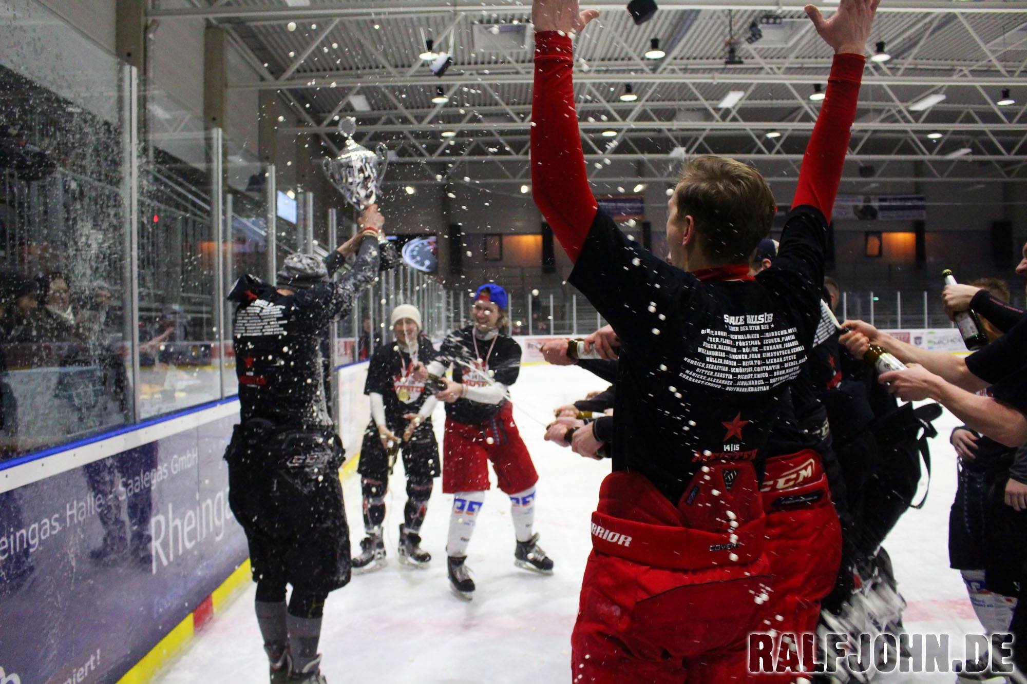 Nach erfolgter Pokalübergabe konnte dann auch die verdiente Party auf dem Eis starten. Herzlichen Glückwunsch an das gesamte Team und alle ehrenamtlichen Helfern. Nach drei schweren Jahren in der Regionalliga mit teilweise hohen Niederlagen, haben es sich die Helden aus der zweiten Reihe verdient, auch wieder einen Titel zu feiern.