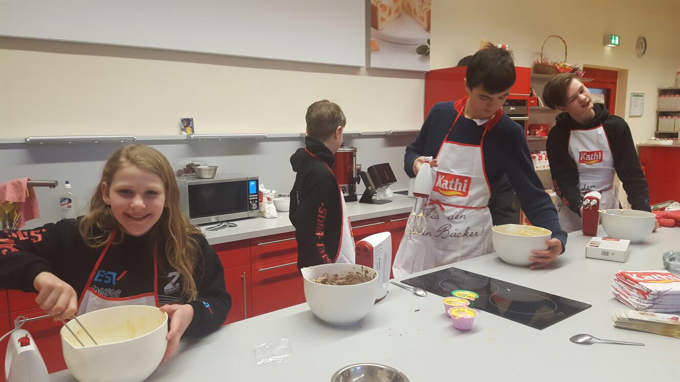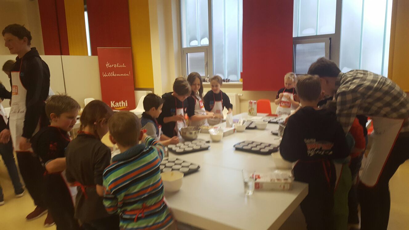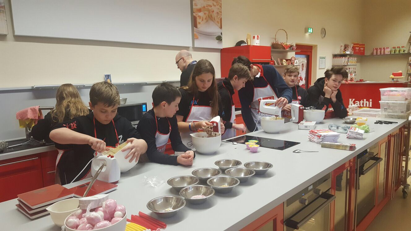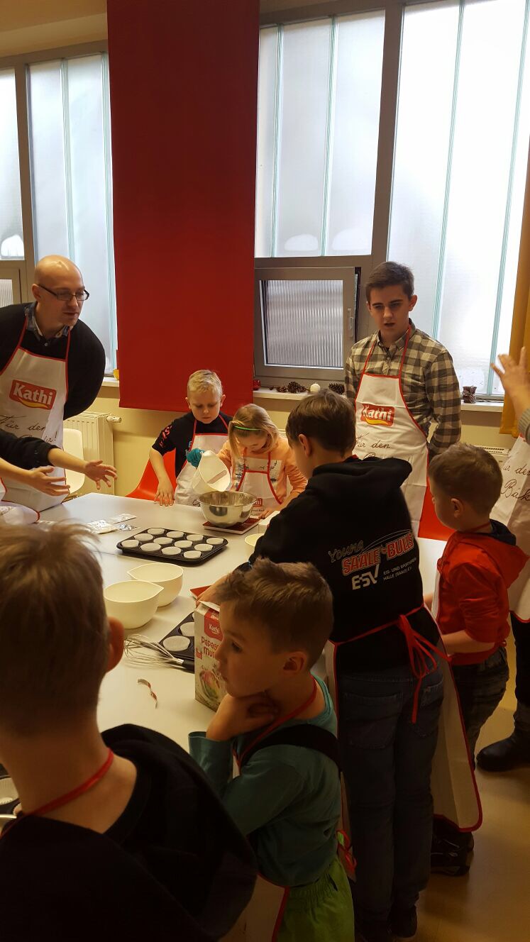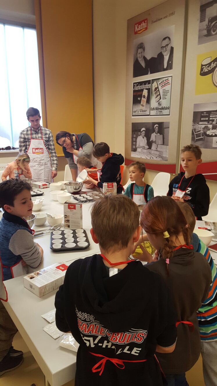 Dieses Mal durften die jungen Sportlerinnen und Sportler mit dem Mannschaftsbus der Saale Bulls zu Kathi "anreisen". Das allein fanden alle bereits ganz "cool". Bei Kathi wurden nach gebührendem Empfang auch wieder zwei Gruppen gebildet. Während die Gruppe der Kleineren Papagei Muffins backen durfte, gab es für die älteren Kinder andere Backmischungen zum Ausprobieren. Dabei mussten eigenständig Zutaten abgemessen und mit dem Teig verrührt werden. Das Naschen vom Teig war ausdrücklich erlaubt. Das ließen sich die meisten nicht zweimal sagen. Während die Muffins dann gebacken wurden, machten sich alle an die Herstellung eines rosa Fondant-Schweinchens. Natürlich bedurfte es dabei der Hilfe der Kathi Mitarbeiter. Das Formen durften die Kinder dann wieder selbst übernehmen. Nachdem das Schwein fertig und die gebackenen Muffins ausgekühlt waren ging es ans Dekorieren. Glasuren wurden in den verschiedensten Farben und Geschmacksrichtungen gemischt. Jeder ganz nach seinem "Gusto". Als alle Muffins verziert waren, ging es ans Einpacken. Jeder bekam seine Muffins im original Kathi-Karton. Mit ihren Kartons bestückt stiegen alle zum Schluss wieder in den Saale Bulls Bus und traten die Rückfahrt zum Eisdom an. Auch hier gilt unser Dank der Firma Kathi, die diesen Ausflug ermöglichte.Ich hoffe den Geschwistern und Eltern zu Hause haben die Mitbringsel auch geschmeckt.