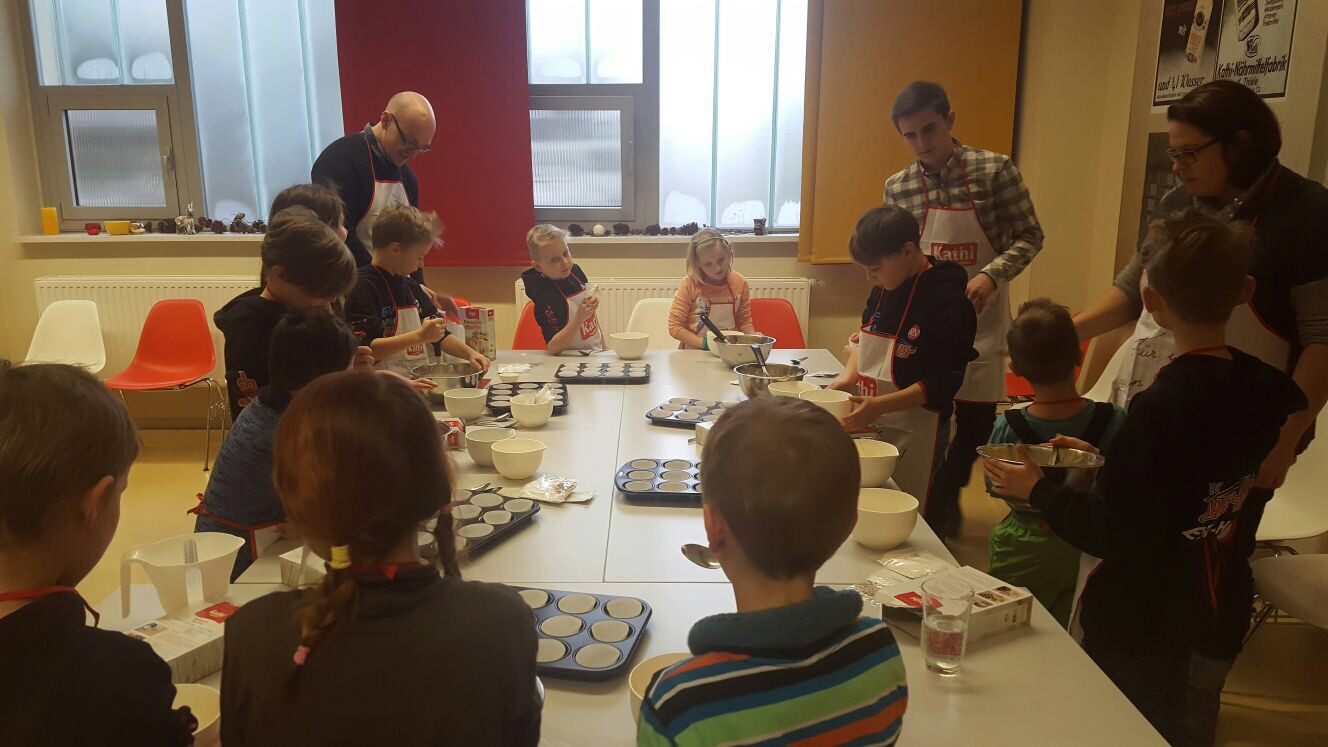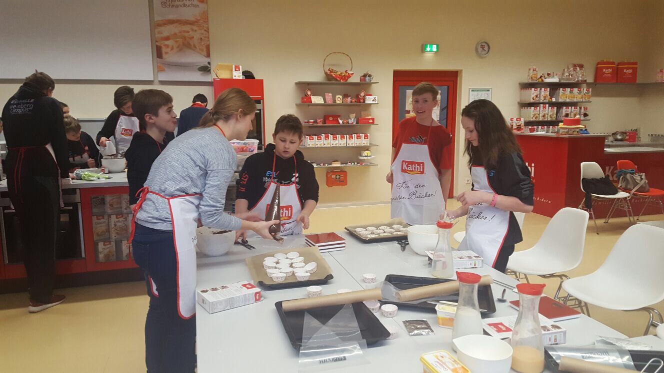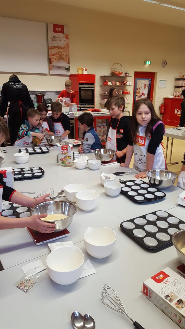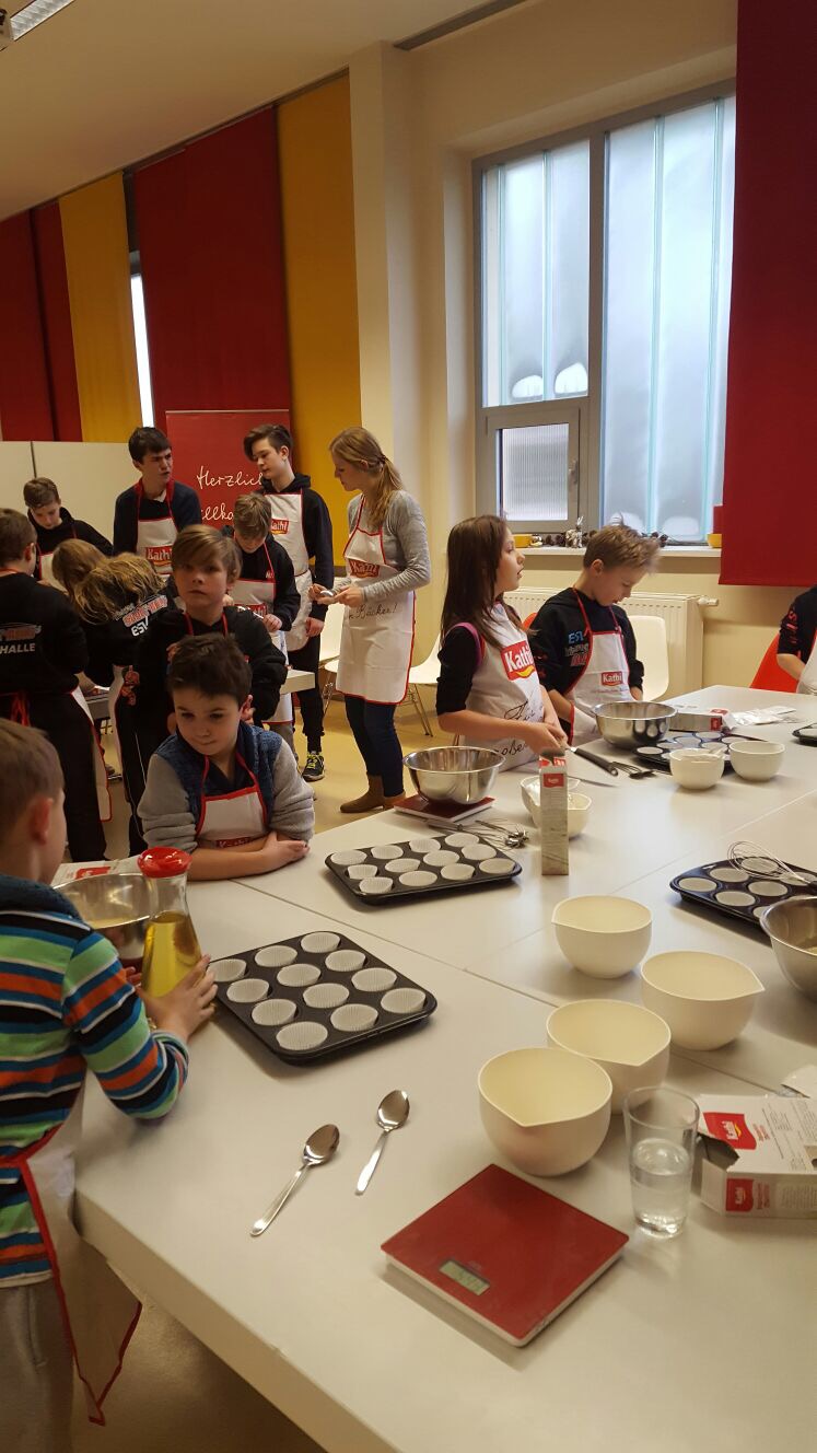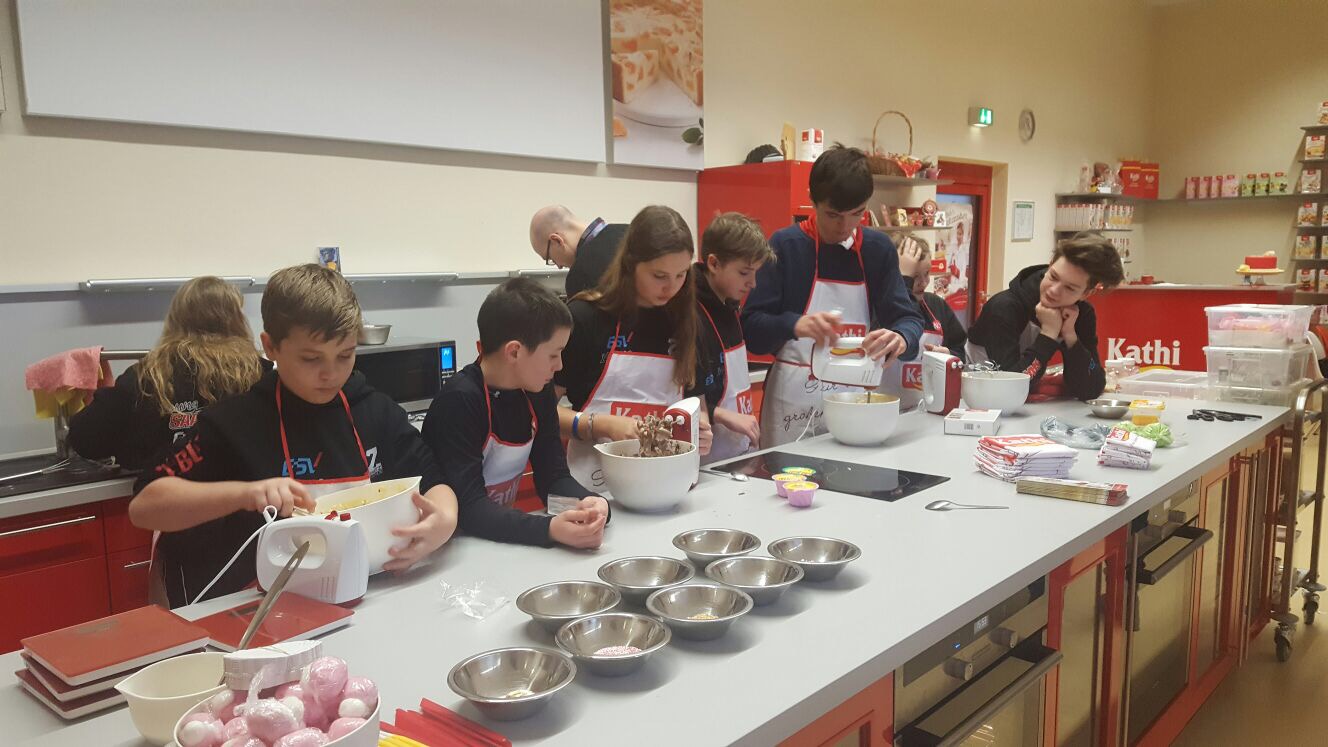 Dieses Mal durften die jungen Sportlerinnen und Sportler mit dem Mannschaftsbus der Saale Bulls zu Kathi "anreisen". Das allein fanden alle bereits ganz "cool". Bei Kathi wurden nach gebührendem Empfang auch wieder zwei Gruppen gebildet. Während die Gruppe der Kleineren Papagei Muffins backen durfte, gab es für die älteren Kinder andere Backmischungen zum Ausprobieren. Dabei mussten eigenständig Zutaten abgemessen und mit dem Teig verrührt werden. Das Naschen vom Teig war ausdrücklich erlaubt. Das ließen sich die meisten nicht zweimal sagen. Während die Muffins dann gebacken wurden, machten sich alle an die Herstellung eines rosa Fondant-Schweinchens. Natürlich bedurfte es dabei der Hilfe der Kathi Mitarbeiter. Das Formen durften die Kinder dann wieder selbst übernehmen. Nachdem das Schwein fertig und die gebackenen Muffins ausgekühlt waren ging es ans Dekorieren. Glasuren wurden in den verschiedensten Farben und Geschmacksrichtungen gemischt. Jeder ganz nach seinem "Gusto". Als alle Muffins verziert waren, ging es ans Einpacken. Jeder bekam seine Muffins im original Kathi-Karton. Mit ihren Kartons bestückt stiegen alle zum Schluss wieder in den Saale Bulls Bus und traten die Rückfahrt zum Eisdom an. Auch hier gilt unser Dank der Firma Kathi, die diesen Ausflug ermöglichte.Ich hoffe den Geschwistern und Eltern zu Hause haben die Mitbringsel auch geschmeckt.