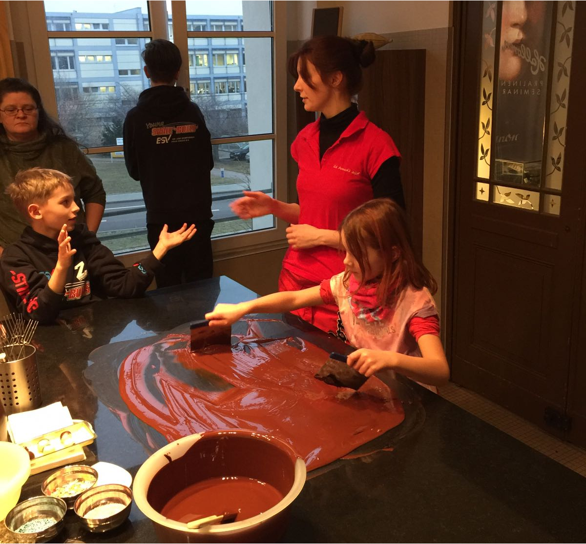 Zuerst ging es für Kinder, Betreuer und Trainer zu Halloren. Nachdem einige Eltern den Fahrdienst (Eishalle-Halloren) übernommen hatten, wurden alle vor Ort herzlich begrüßt und anschließend in zwei Gruppen aufgeteilt. Eine Gruppe erhielt eine Führung, während die andere Gruppe parallel selbst Hallorenkugeln herstellen durfte. Zu Beginn der Führung gab es ein kurzes Einstiegsseminar. Nach der Theorie wurde dann eine Produktionshalle besichtigt. Dabei erfuhren Kinder, Betreuer und Trainer wo z.B. Kakaobohnen herkommen und wie genau eigentlich Schokolade hergestellt wird. Am Ende durften alle auch ihre eigenen "Werke" mitnehmen. Und glaubt es mir. Die selbst gemachten Hallorenkugeln schmeckten, wie sie schmecken müssen! Ein großes Dankeschön an die Firma Halloren für das schöne Erlebnis.Kathi öffnete seine Türen für Eishockeykinder