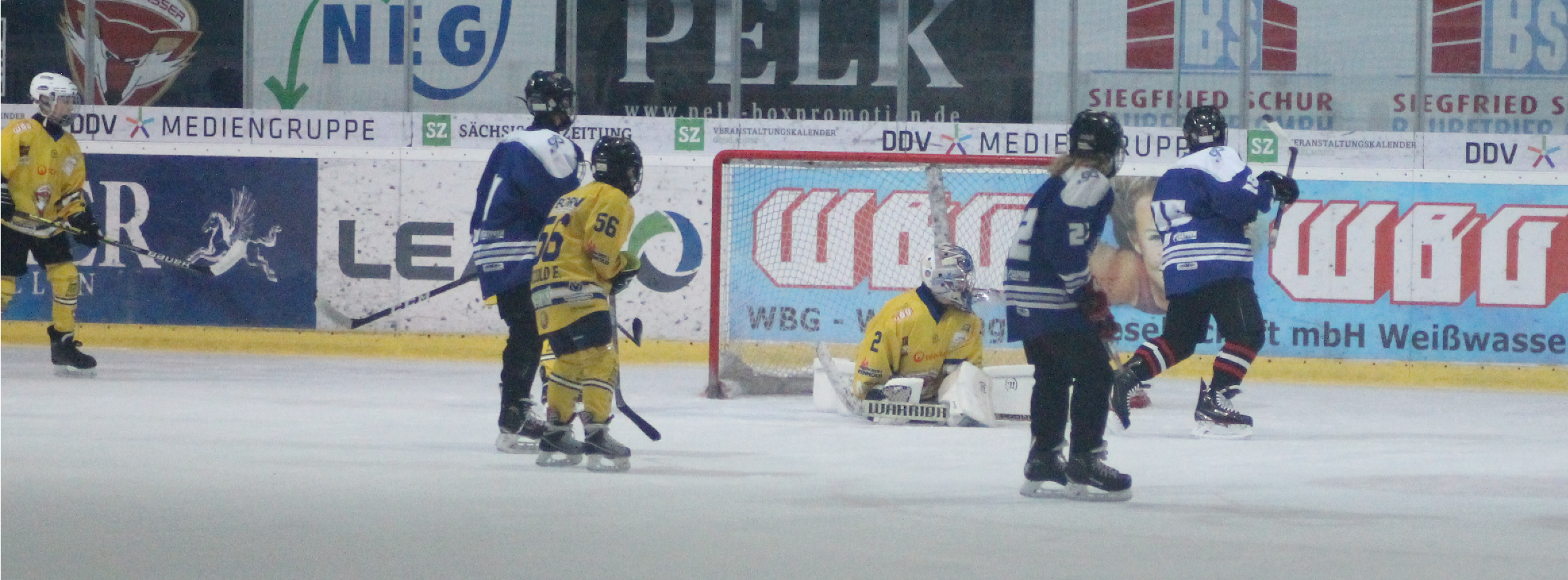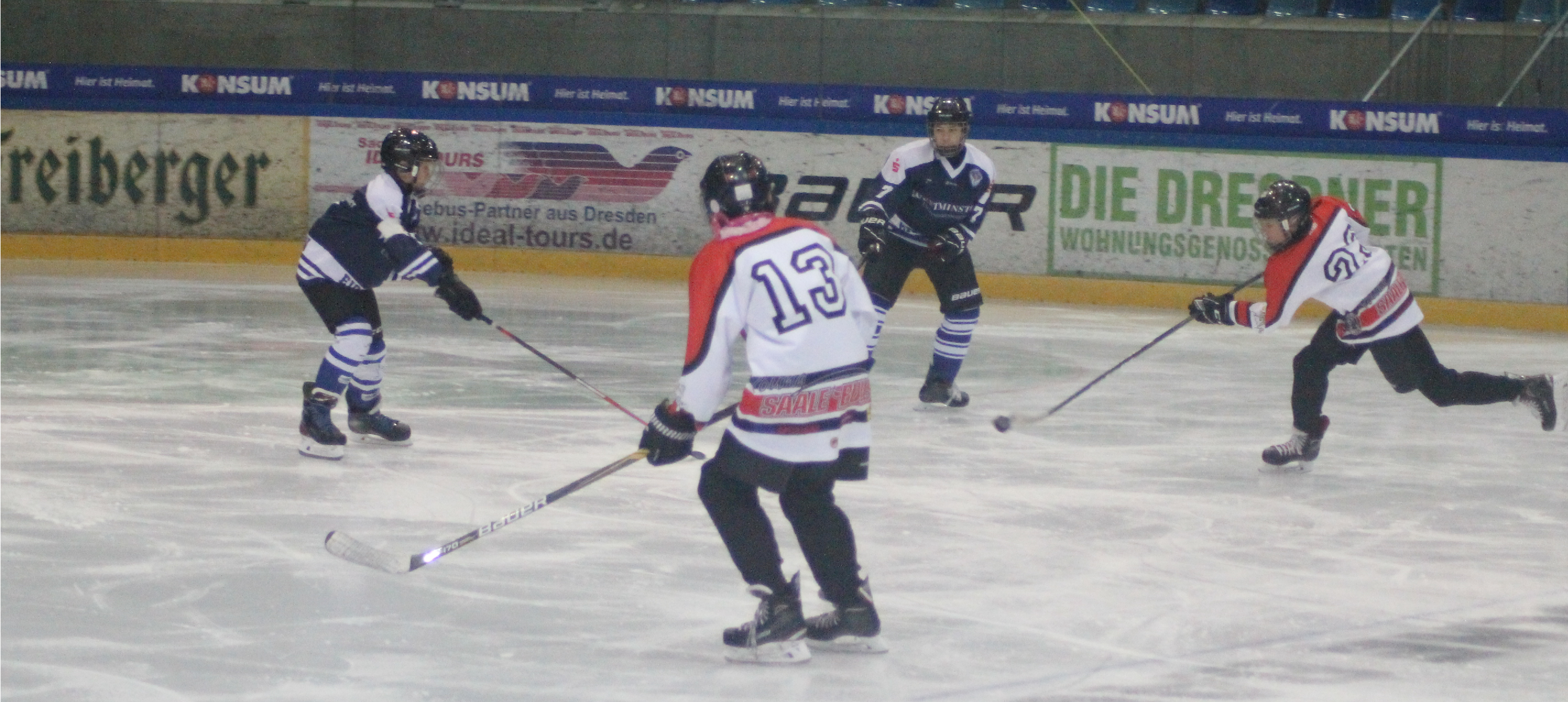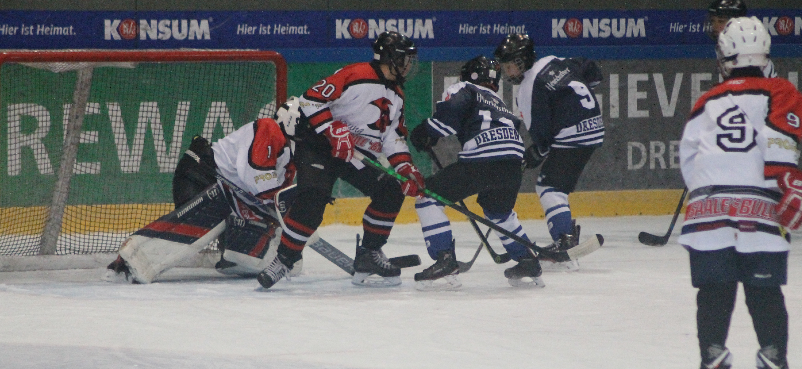 Am Sonntag ging es dann zum Topteam der Liga nach Dresden. Nach dem doch schwer verdaulichen Auftaktspiel gegen die Ostsachsen sollte dieses Mal mehr Gegenwehr kommen. Und die kam von unserer Spielgemeinschaft auch. Dieses Mal war auch der Stammtorhüter der Blues mit an Board. Motiviert und konzentriert gingen die Jungs und Mädels ans Werk. Die Sportler_innen aus Berlin und Halle machten den Eislöwen Juniors tatsächlich das Leben schwer. Man sah den Coach der Dresdner gestikulieren und hörte auch seine Ermahnungen laut durch die Halle klingen. Das ermunterte wiederum Coach Linke und sein Team. Immer mehr wagten es die Spieler_innen der Young Saale Bulls, Blues und des OSC sich in das Spiel nach Vorne einzuschalten. Dem ganzen Ansturm der Dresdner setzte unser Team immer wieder Gegenangriffe entgegen und spielte mehrfach auch im Drittel der Eislöwen Juniors. Der Torhüter unserer Spielgemeinschaft verhinderte öfter auch mal gefährlich platzierte Schüsse der Gegner. Zwar nicht alle, aber am Ende des ersten Drittels stand es gerade Mal 4:0 für die Hausherren. Im Vergleich zum Hinspiel ein echt schwer erkämpftes, sehr gutes Zwischenergebnis.